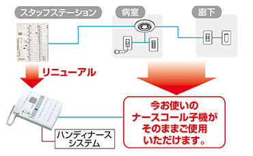 NBM-HPは、弊社同時通話タイプをお使いの病院・施設では病室子機や配線がそのまま使えるので、リニューアルに最適です。